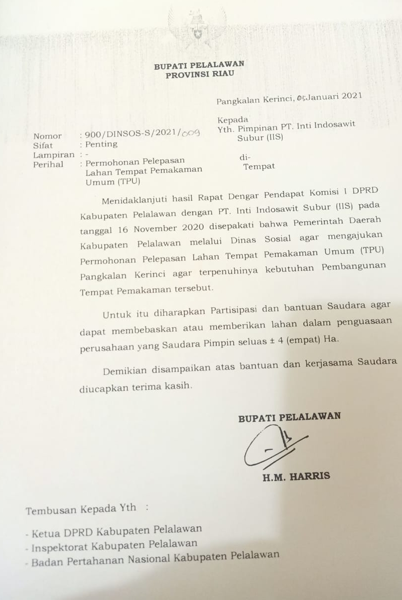 Surat yang ditandatangani oleh Bupati Pelalawan HM. Harris, tertulis bahwa pihak Pemerintah Daerah Kabupaten pelalawan meminta kepada pihak PT Inti Indosawit Subur agar dapat membebaskan atau memberikan lahan HGU seluas -/+ 4 hektar kepada pemerintah kabupaten pelalawan guna dijadikan lahan Tempat Pemakaman Umum (TPU).