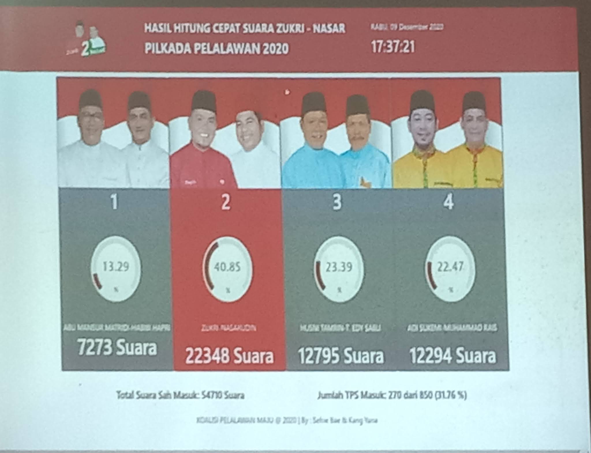 Dilansir dari gardapos.com dilapangan, versi hasil hitung cepat suara Zukri - Nasar Pilkada Pelalawan 2020 sekira pukul 17:37 Wib dengan data sementara jumlah TPS masuk 270 dari 850 (31,76%) di rumah pemenangannya menyebutkan: