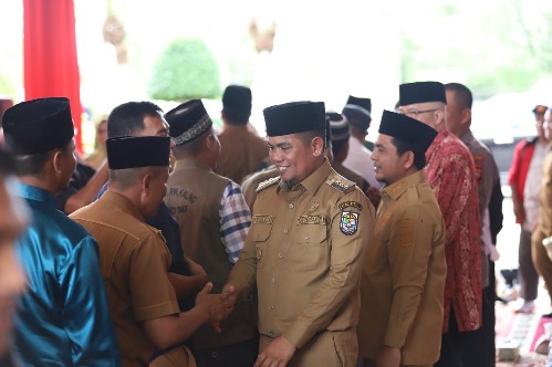 Usai pelaksanaan apel, Bupati H. Zukri bersama Wabup H. Nasaruddin, Sekda Pelalawan H. Abdul Karim dan Asisten serta kepala OPD di lingkungan Pemkab Pelalawan melakukan halal bihalal bersama ASN dengan saling berjabatan tangan untuk saling bermaaf-maafan. (Advertorial/Erik Suhenra )
