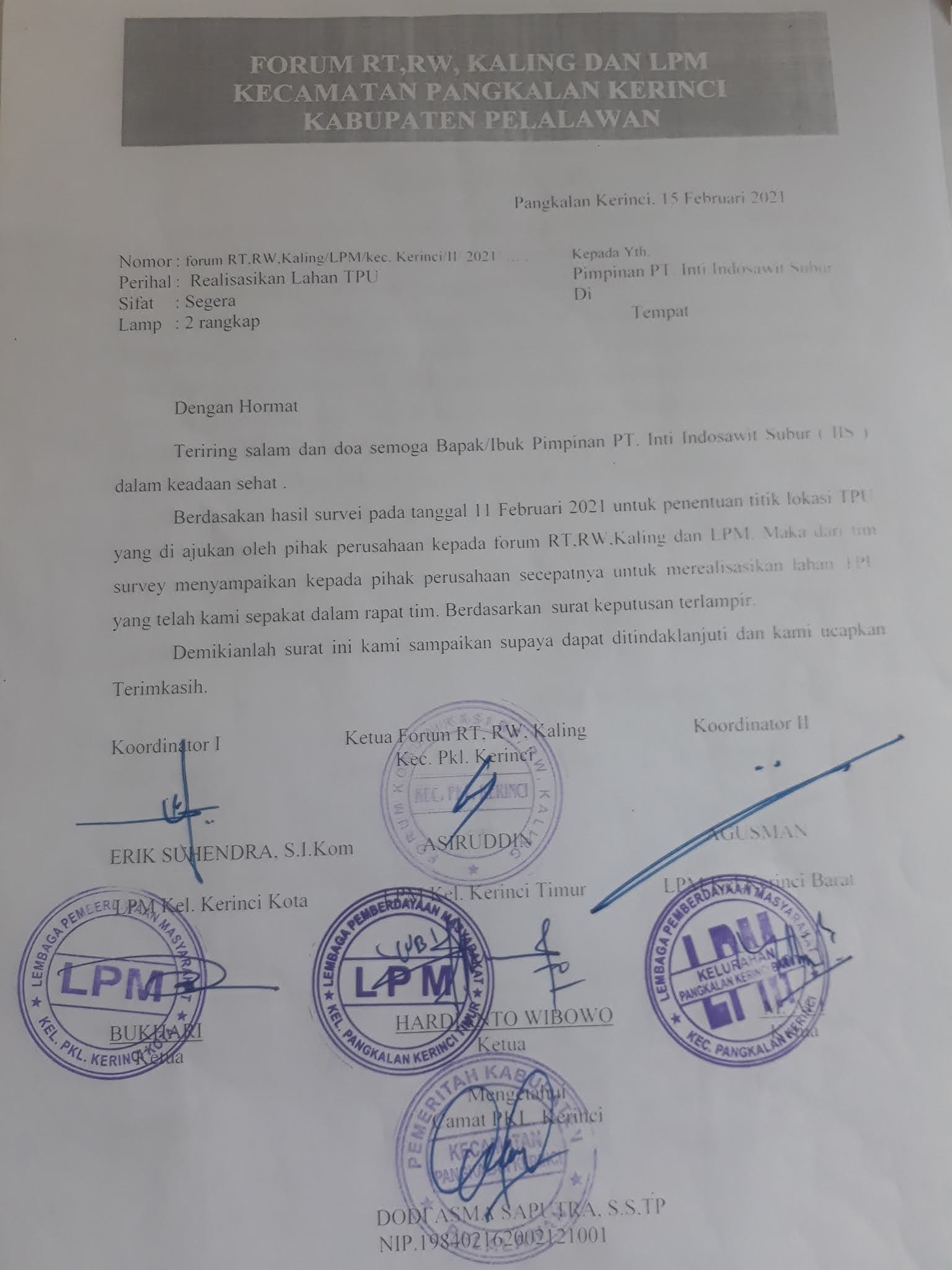 PELALAWANPOS.COM-Forum RT/RW, Kaling dan LPM Kecamatan Pangkalan Kerinci melayangkan surat realisasi lahan TPU kepada PT Inti Indosawit Subur. Hal ini dilakukan menindak lanjut hasil survei lahan Tempat Pemakaman Umum (TPU) Kecamatan Pangkalan Kerinci.